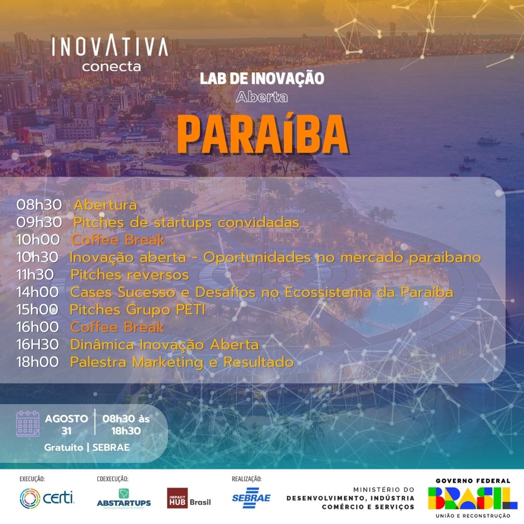João Pessoa/PB será casa do Lab de Inovação Aberta do InovAtiva Hub Conecta com a execução da Fundação CERTI e ABSTARTUPS e a realização pelo SEBRAE PB.